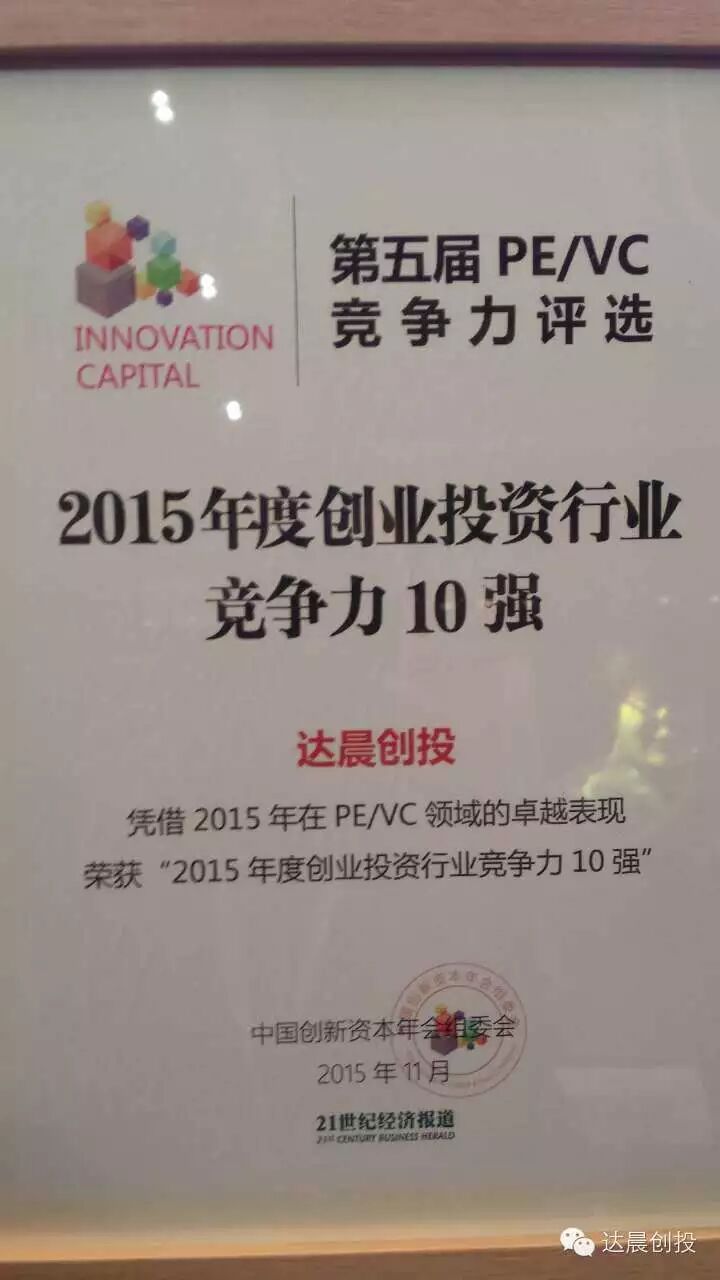 会议同时公布了”2015年度创业投资行业竞争力10强”,我公司凭借2015年在PE/VC领域的卓越表现入选10强。